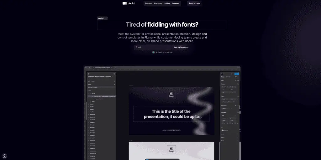 The problem with traditional presentation processes is apparent. You might spend hours transferring designs from applications like Figma, risking errors and deviations from the intended aesthetics. Often, existing templates lack updates, leading to inconsistencies across presentations. Deckd addresses these issues by allowing direct import of slide designs from Figma. This ensures that team members can easily manage text and visuals while maintaining design elements dictated by designers.