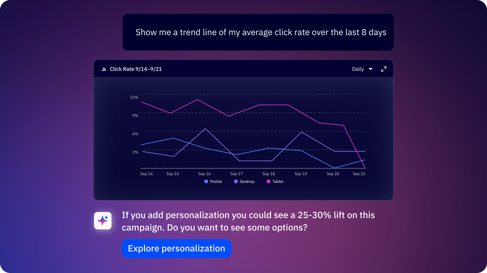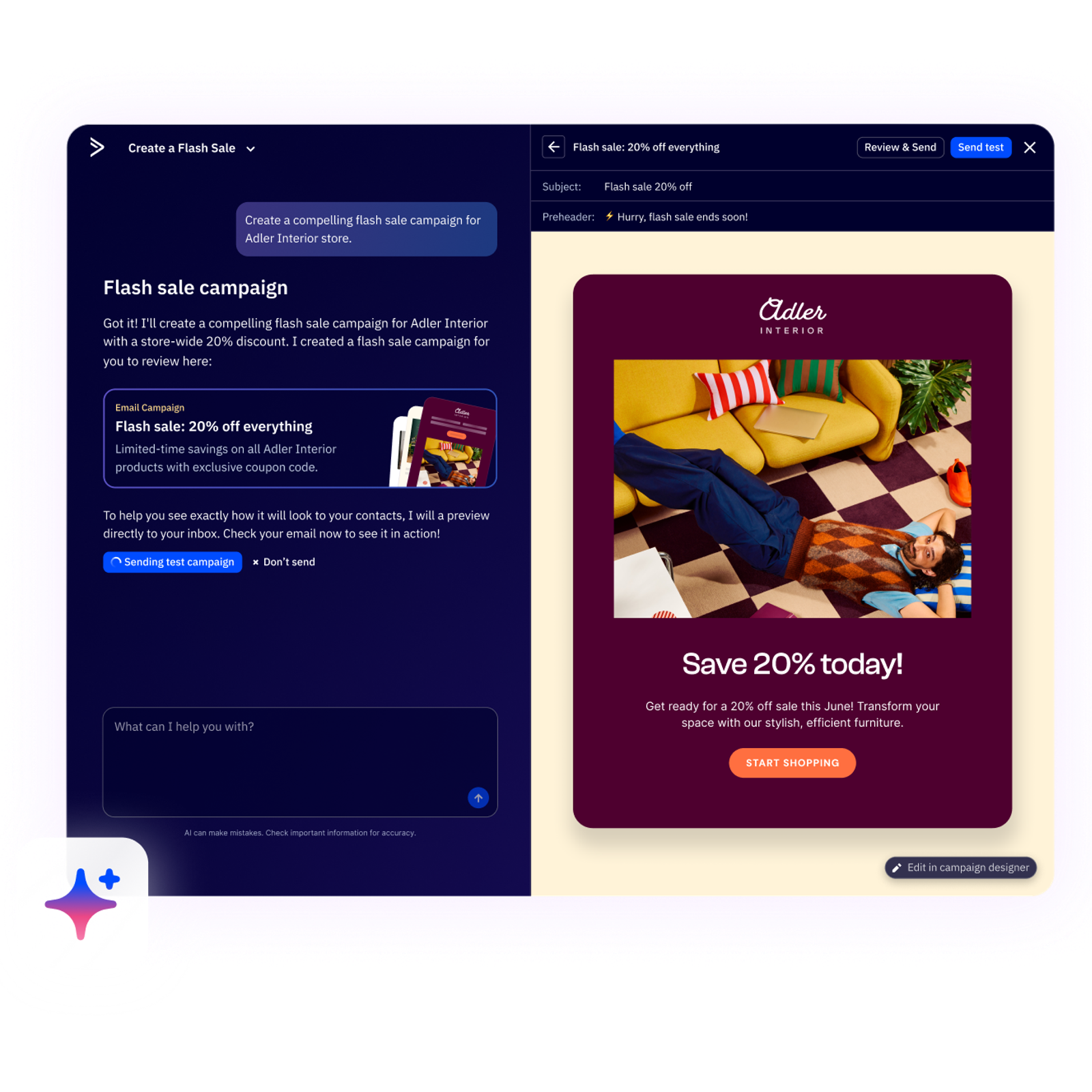 Build marketing interactions your way with our powerful editor, or ask AI for instant optimization—moving faster and getting results at any scale.