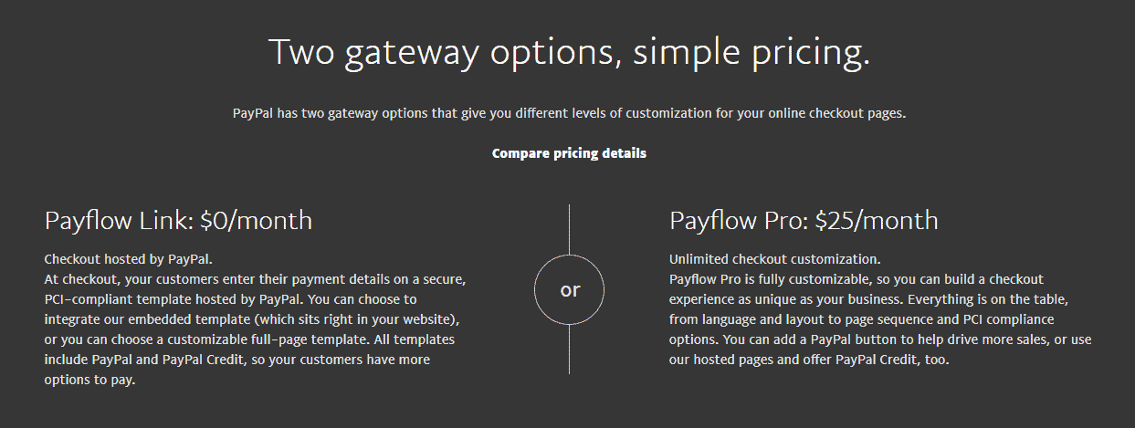 - Payflow Pro: The premium plan which gives the user the ability to design his own checkout page. It is priced at $25 per month.